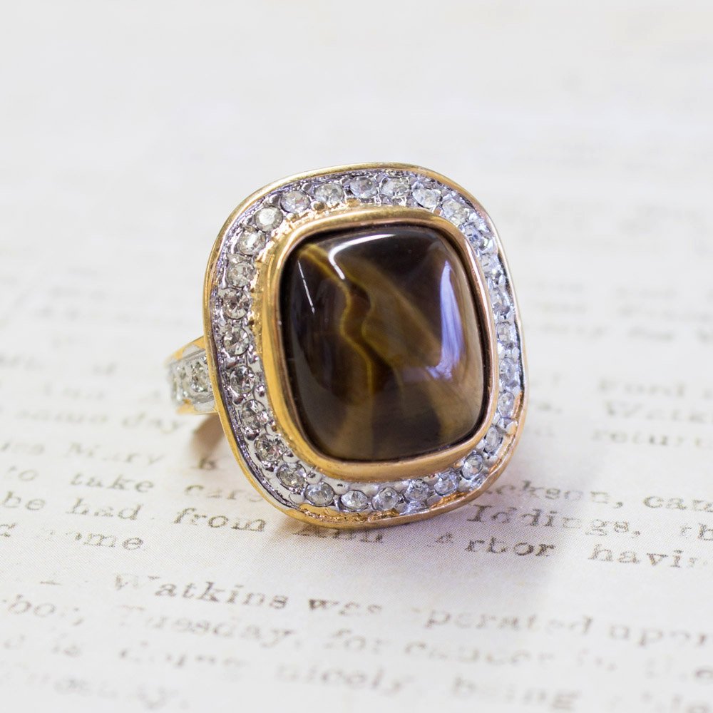 Vintage Ring Genuine Tiger Eye Swarovski Crystals 18k Gold Cocktail Ring #R1974 Size: 10
